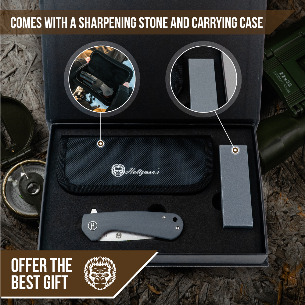 • ✅ GET YOUR HANDS ON A COMPLETE POCKET KNIFE KIT: The sharpening stone will make sure your blade is always razor sharp and the carrying case will keep your EDC knife safe and always at hand.