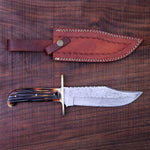 The Western Bowie Knife is a tribute to timeless craftsmanship and rugged functionality. This custom handmade knife features a 15-inch overall length and a 10-inch full tang Damascus steel blade, ensuring strength and durability. Its bone handle, paired with a polished brass guard, provides an ergonomic and secure grip while adding a touch of classic elegance. The knife is accompanied by a premium leather sheath for safe storage and easy carry, making it an ideal choice for hunting, outdoor survival, or as a collector's piece. Own a symbol of tradition and power with this one-of-a-kind Western Bowie knife.