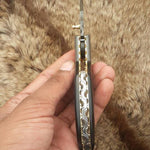 The Legacy is an exceptional everyday carry folding pocket knife, expertly handcrafted for both style and performance. Featuring a 3-inch Damascus steel blade, it combines sharpness with a distinctive pattern that highlights its craftsmanship. The handle, made from luxurious buffalo horn with a Damascus bolster, offers both elegance and durability. A standout feature is the intricate file work on the liner and spine, adding a touch of artistry to its design. With a reliable liner lock mechanism and a premium leather sheath for protection, The Legacy is a dependable choice for daily use. The blade’s Rockwell Hardness of 55-58 HRC ensures enduring sharpness and resilience. Available exclusively at KBS Knives Store.