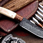 Experience the perfect blend of functionality and artistry with our Custom Hunting Knife. Expertly handcrafted, this knife boasts a 4.5-inch blade made from full tang hand-forged Damascus steel, ensuring both exceptional strength and stunning aesthetics. With an overall length of 9 inches, it offers the ideal balance for precision and comfort during your hunting adventures. The handle, crafted from a combination of rosewood and bone, provides a beautiful grip that enhances durability and control. Each knife comes with a quality leather sheath for safe storage and easy transport, making it a must-have for any hunting enthusiast.