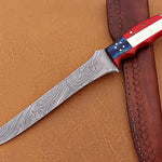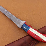 Handmade Damascus Steel Fillet-Boning Knife with Texas Flag Red-Blue Exotic Wood and Bone Handle - 13 Inch Overall Length