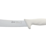 A chopper knife in meat processing is typically used for cutting through dense and tough cuts of meat, particularly during the initial stages of breaking down larger pieces into smaller, more manageable portions. These knives are designed with sturdy, wide blades and are often used with a mallet or hammer to apply force, allowing the butcher or meat processor to efficiently chop through bones and tougher connective tissues. Chopper knives are essential tools in meat processing facilities for tasks such as portioning, trimming, and preparing meat for further processing or packaging.