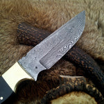 Introducing our Custom Handmade Fixed-Blade Hunting Knife, featuring a full tang raindrops Damascus steel blade designed for durability and precision. This 10-inch knife is equipped with a buffalo horn handle and brass bolsters, providing an elegant and secure grip. With a Rockwell Hardness of 55-60 HRC, it ensures excellent edge retention and performance for everyday use. The knife comes with a stylish leather sheath for safe storage and transport, making it an essential tool for any outdoor enthusiast.