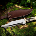 The Mountain King Classic Hunting Bowie Knife is a custom handmade knife built to stand the test of time. Crafted with high carbon steel, the 9-inch blade delivers unmatched sharpness and strength, perfect for rugged hunting expeditions or outdoor adventures. The 14-inch overall length offers a balance of reach and control, while the handle, made from authentic antler horn, ensures a natural grip that feels comfortable in hand. A brass guard adds durability and protection, giving this Bowie knife both aesthetic appeal and functional resilience.