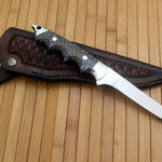 The blade is razor sharp, flexible, and holds an edge, making it ideal for preparing fish, meat, or game with ease. Its handle is crafted from epoxy pine resin with a steel bolster, giving it a secure grip, durability, and a unique appearance.