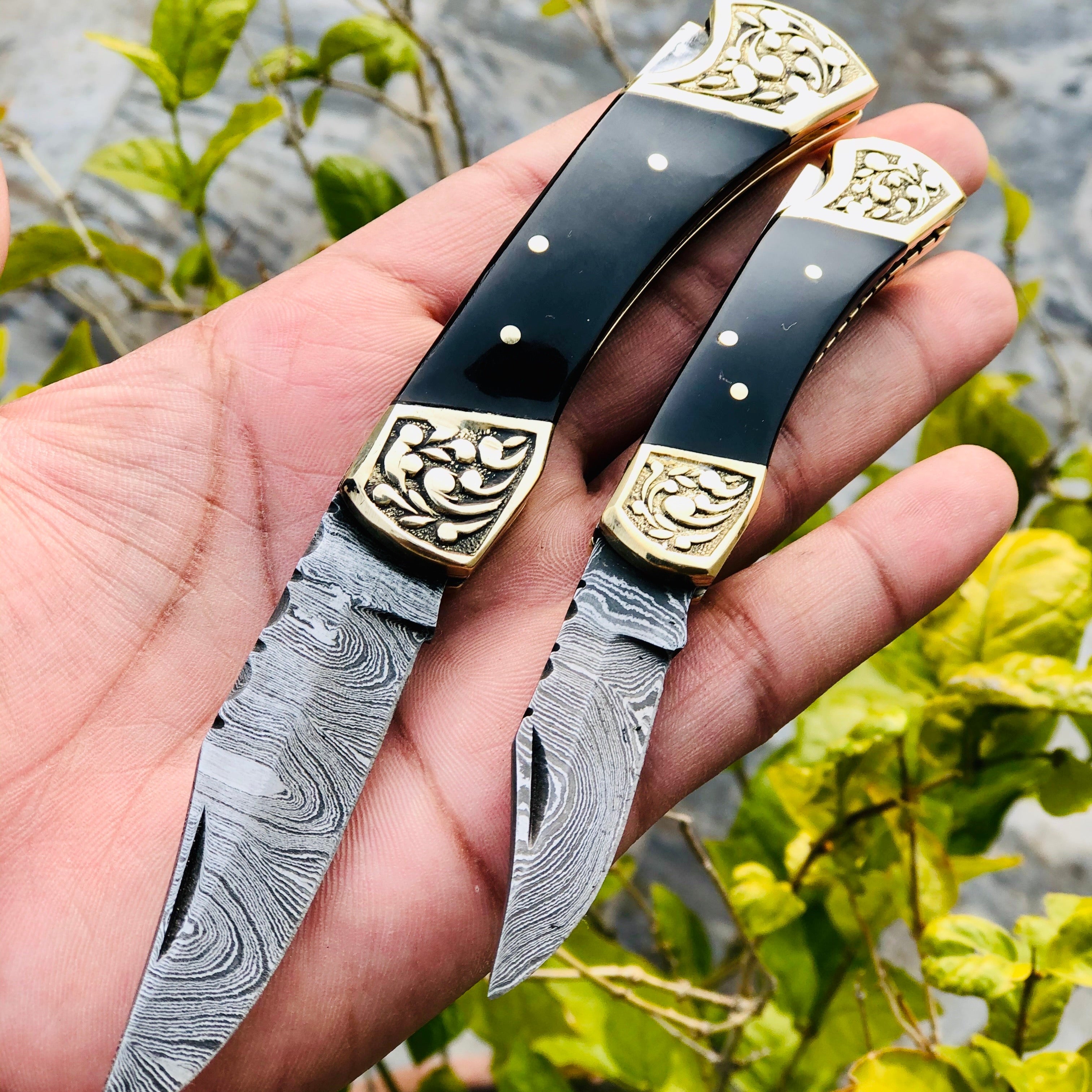 Pair of Custom Handmade Damascus Steel Folding Pocket Knives with Buffalo Horn and Engraved Brass Bolsters Handle