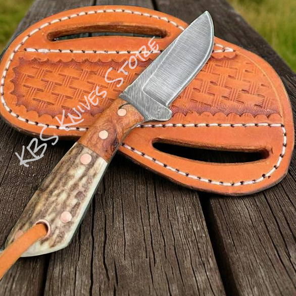 Custom Damascus Steel Deer Gutting Knife with Antler Handle & Gut Hook