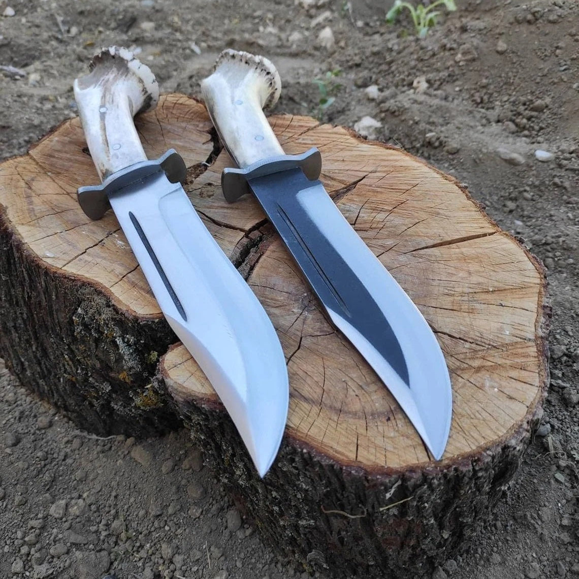 High-Carbon 1095 Forged Steel Bowie Knife - Handmade Deer Horn Guard Handle, Leather Sheath Included