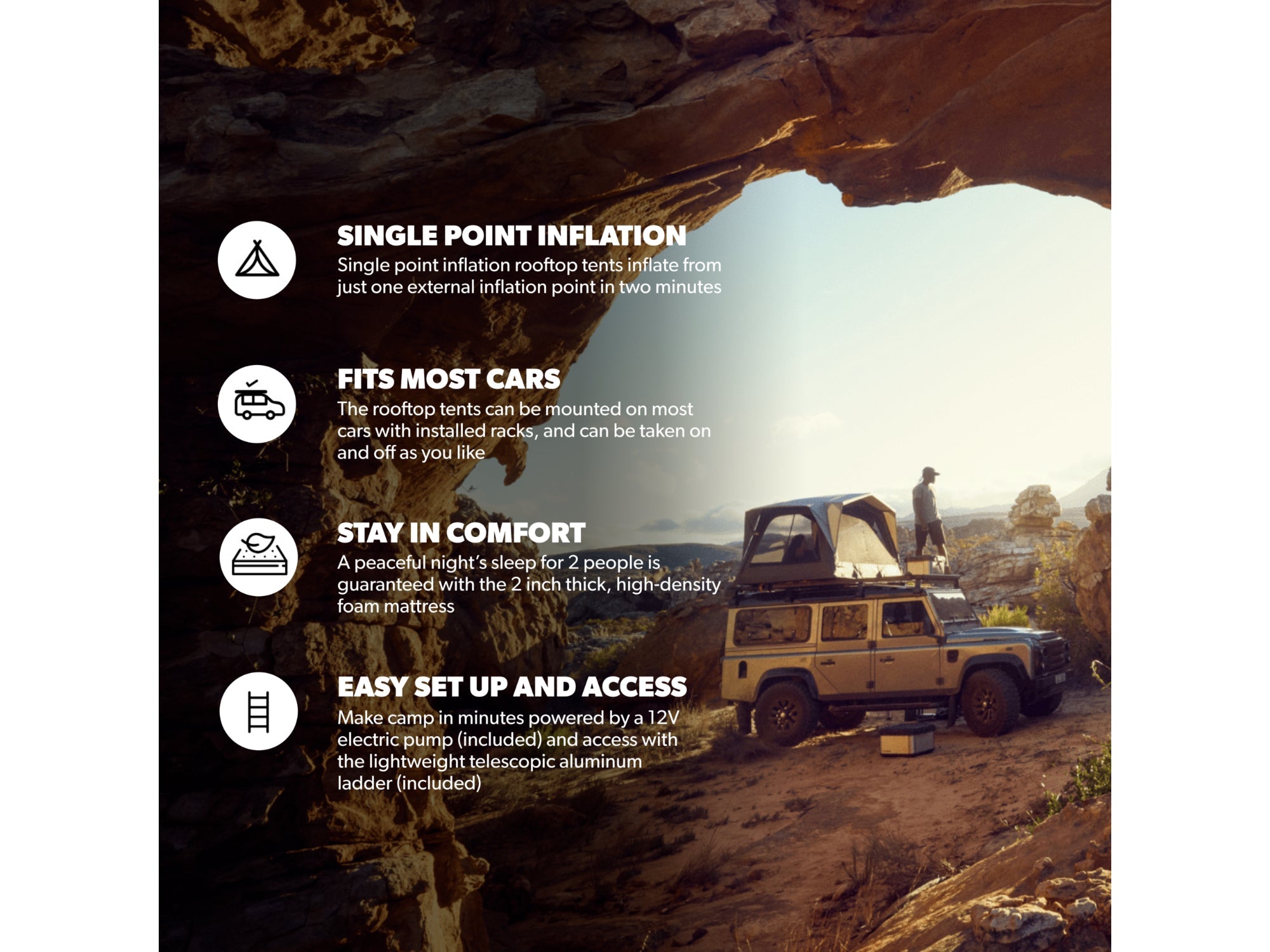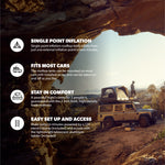 The Dometic TRT 140 AIR rooftop tent is a great option for any overlander experienced or advanced. It's lightweight design makes it compatible with virtually any vehicle. Make sure to get a roof rack! Set up takes around 3 minutes and the tent deflates in 30 seconds. Skylights and visible 360 degree windows make this a great tent option.