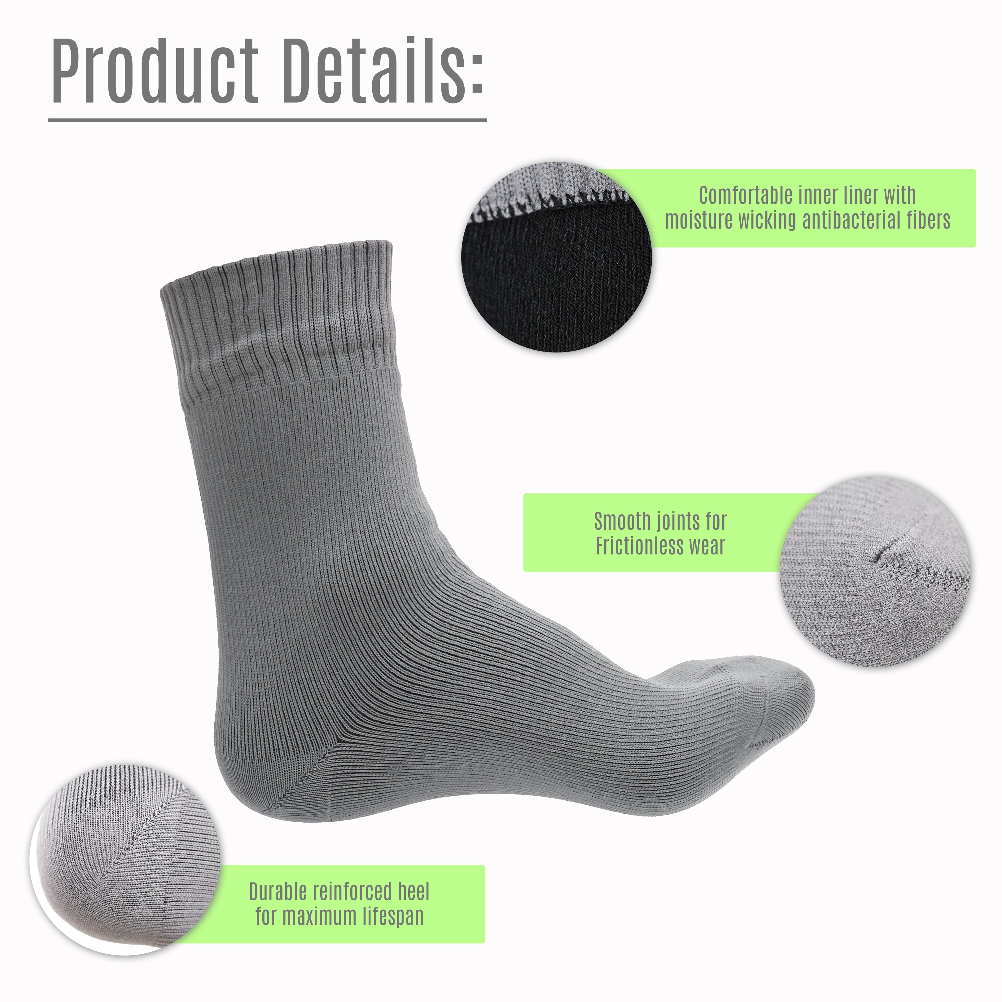 Three-layer construction keeps your feet 100% dry. Socks can be worn the same as any other pair of socks you own. Note that they are thicker than your average socks and may not fit in every shoe. Designed for all ages. Seamless toe, cushioned heel, and elastic cuff. Socks are waterproof from the toe to the bottom of the cuff. Must have accessory for all of your outdoor needs! Our socks are designed for outdoor enthusiasts, military personnel, postal workers, and everyone who is tired of wet feet. The material is designed to help fight odor. Keep your feet dry and cool all day long. Designed to prevent blisters and chafing 3-layer construction includes the outer layer (93% nylon, 7% elastane), Middle layer (Waterproof and breathable membrane), and inner layer (66% Coolmax, 30% polyester, 4% elastane). High performance knit fabric. Coolmax was designed to have improved breathability over natural fibers like cotton to achieve better performance in athletes. Moisture is drawn from the skin and can evaporate so that when you sweat, you're not left feeling damp and uncomfortable. Made from high quality waterproof materials and can be worn the same as any other pair of socks. The difference is these socks will keep your feet dry in a downpour or while walking through creeks, rivers, mud, sand, or even on the golf course in wet conditions. Creates a highly desired cooling effect that helps the wearer stay dry and comfortable to optimize performance.