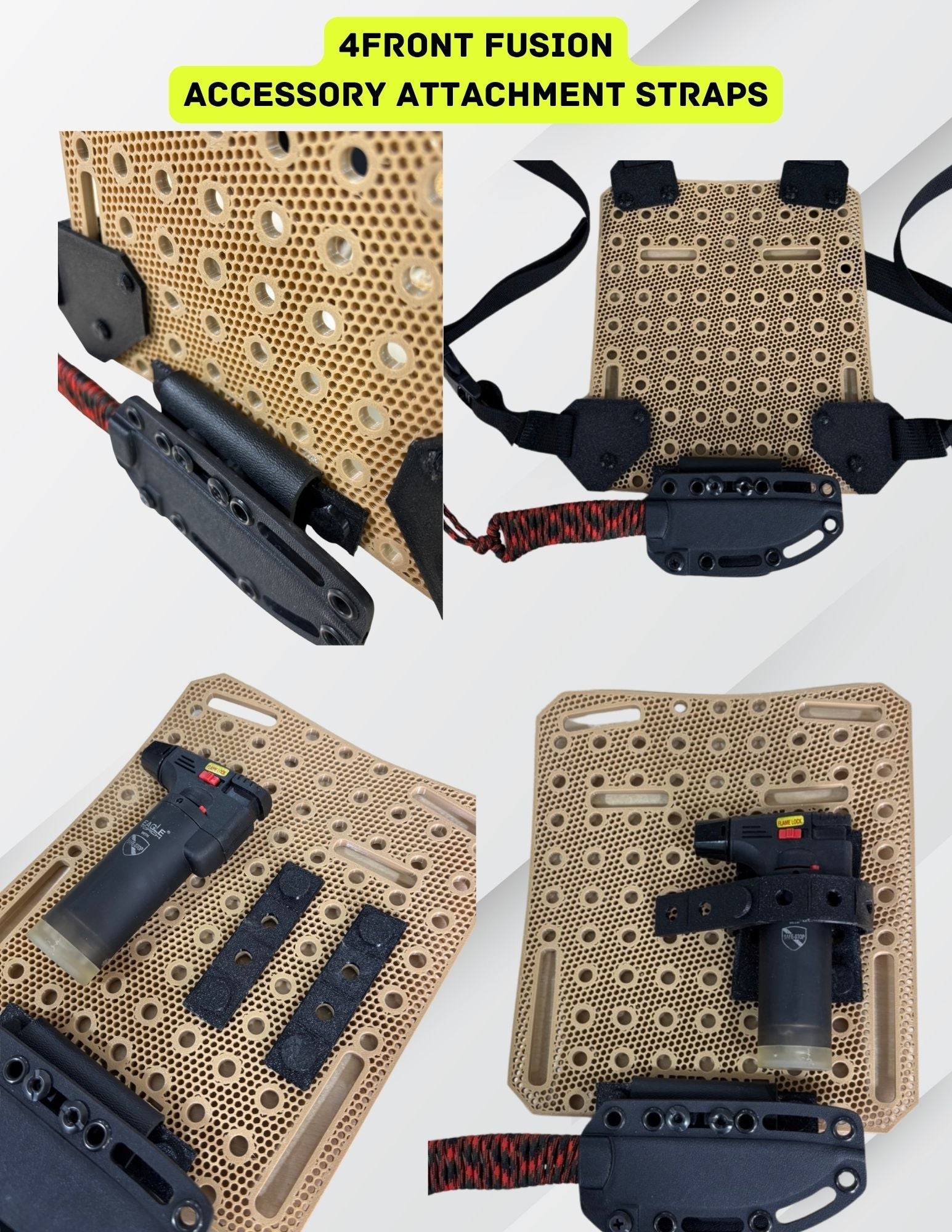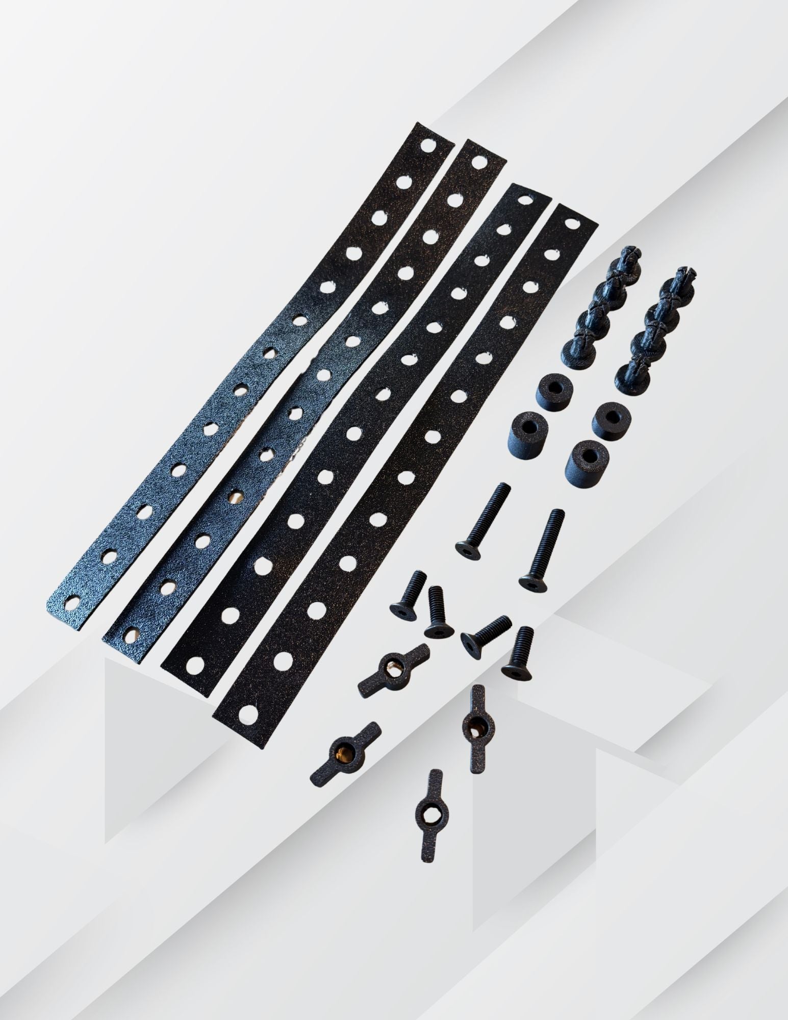 This kit comes with (4) of our 9.5" cut-to-length accessory straps and a variety pack of push-rivets, M5 screws and wing nuts. Everything you need to get creative with your kit!