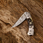 Elevate your gift-giving with the Best Custom Handmade Damascus Steel EDC Folding Pocket Knife from KBS Knives. This premium knife features a 3-inch blade crafted from high-quality Damascus steel, known for its superior sharpness and distinctive pattern. The handle is made from elegant sheep horn, complemented by Damascus steel bolsters for a blend of durability and sophistication.