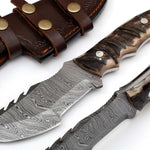 Discover the epitome of outdoor versatility with our Best Tracker Knife, designed to meet the demands of adventurers and survivalists. This exceptional knife boasts a Full Tang Damascus Steel Blade and a handle crafted from rugged Micarta Sheep Horn. With an impressive overall length of 9.5 inches, it's the ultimate outdoor companion, complete with a horizontal leather sheath. Exclusively available at KBS Knives Store, where quality meets functionality.