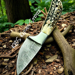 The Damascus steel blade ensures durability and edge retention, while the antler horn handle with steel bolster provides a secure, natural grip with classic western style.
