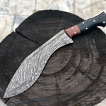 The Collectible Nepalese Kukri is a handmade masterpiece that blends traditional craftsmanship with modern materials, making it both functional and visually striking. With an overall length of 15 inches and a 10-inch Damascus steel blade, this kukri is built for performance, durability, and timeless appeal. The blade features a fuller, adding strength and balance while highlighting the artistry of Damascus steel patterns.