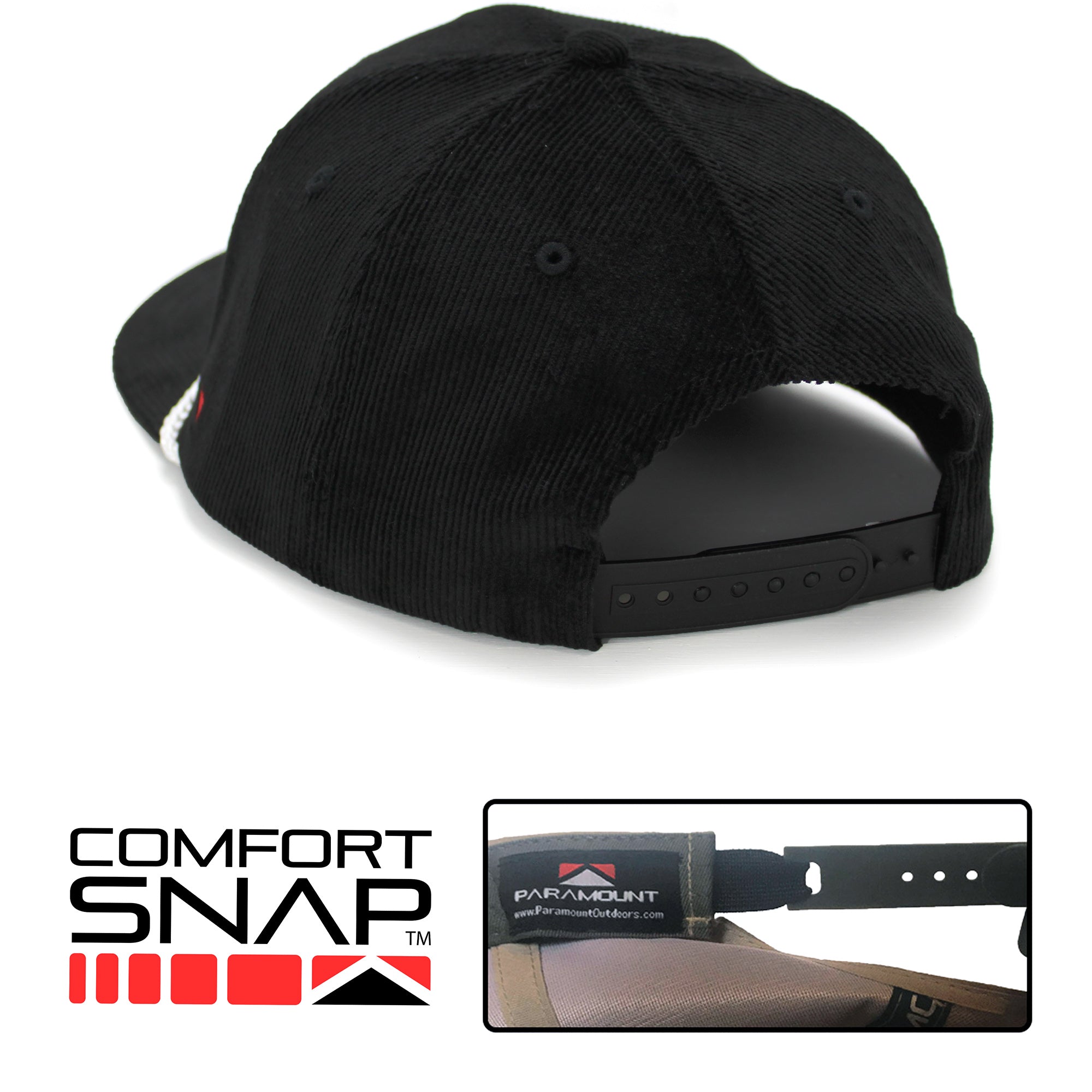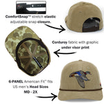 The corduroy wood duck hat is built on our Riverside 6-Panel rope cap style. This unique wood duck hat design features a vintage throwback style on corduroy fabric. Our throwback camo is printed on the under crown and visor for a finished look. Our COMFORT SNAP™ snapback closure combines the stretch of elastic with the adjustability of a snapback, allowing for a custom stretch fit. Lastly, this wood duck hat features our American™ Fit sizing that fits men’s US head sizes MD – XX.