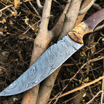Custom Handcrafted Damascus Steel Hunting Bowie Knife with Rosewood & Sheep Horn Handle – 13-Inch Blade for Sale by KBS Knives