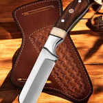 Elevate your cutting experience with the Bull Cutter knife, a custom handmade masterpiece designed for precision and durability. Measuring an overall length of 7 inches, this knife features a 3.1-inch full tang D2 steel blade, renowned for its sharpness and edge retention. The handle is a perfect blend of rosewood and bone, providing both aesthetic appeal and a comfortable grip, while the steel bolster adds stability and strength to the design. Complete with a durable pancake leather sheath, this Bull Cutter knife is ready for any adventure or task, making it the ideal companion for outdoor enthusiasts and collectors alike.