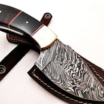 Achieve precision and style in the field with this Custom Handmade Damascus Deer Skinning Knife. Measuring 8 inches in total length, with a razor-sharp 4-inch full tang Damascus steel blade, this knife is engineered for efficiency and durability. The stunning handle is crafted from a combination of buffalo horn, rosewood, and a brass bolster, providing both a secure grip and an elegant aesthetic. Designed specifically for hunters, this knife excels at skinning game, making it a must-have tool for your outdoor adventures.