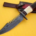 Experience the perfect blend of style and functionality with our exquisite hunters knife. This custom handmade knife features an overall length of 12 inches, with a blade length of 7 inches crafted from full tang Damascus steel, ensuring unmatched sharpness and durability for all your hunting needs. The handle is elegantly designed with rosewood and adorned with camel bone accents, complemented by a striking Damascus steel guard for added flair. Each knife comes with a high-quality leather sheath for safe and convenient storage, making it an ideal companion for your outdoor adventures.