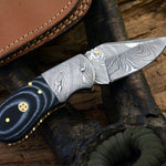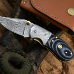 Custom Handmade Damascus Steel EDC Small Folding Pocket Knife with Canvas Micarta Handle and Leather Case by KBS Knives Store.