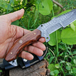 Custom Handmade Damascus Tanto Tracker Knife with Rosewood Handle - 10 inches Overall Length, Serrated Top Blade