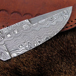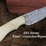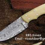 Introducing our Fixed Blade Skinning Knife, meticulously crafted for precision and durability. With an overall length of 8 inches and a 4-inch full tang Damascus steel blade, this knife is designed to handle all your skinning needs with ease. The bone handle offers a comfortable grip, ensuring stability and control during use. This custom handmade knife comes with a high-quality leather sheath, providing protection and making it convenient to carry on your outdoor adventures. Elevate your hunting toolkit with this exceptional fixed blade skinning knife, blending beauty and functionality.