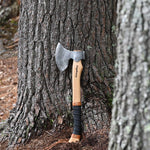 Discover the exceptional craftsmanship of the Viking Axe from KBS Knives Forged Factory. This axe features a custom handmade forged 1095 steel blade, known for its outstanding sharpness and durability. The handle is crafted from ash wood and wrapped in leather for a secure, comfortable grip. Designed as a full working tool, this axe boasts a Rockwell Hardness of 55-60 HRC, ensuring it maintains a sharp edge through extensive use. Each Viking Axe comes with a durable leather sheath for protection and easy carrying, making it ideal for both practical use and display.