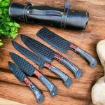 Transform your kitchen experience with this exquisite custom kitchen knife set. Each knife in this collection is thoughtfully crafted for both beauty and functionality. Ranging from 13 inches to 8.5 inches in overall length and featuring blade lengths from 8 inches to 4 inches, these knives are versatile enough to handle any culinary task. The blades are made from full tang hand-forged stainless steel, coated with a sleek black powder finish that enhances durability while providing a contemporary look. The handles are constructed from exotic wood with rosewood accents, offering a comfortable grip and a touch of elegance. This set comes complete with a stylish leather roll, making it perfect for chefs on the go or for showcasing in your kitchen.