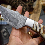 Custom Skinning Hunter’s Knife | Raindrops Damascus Steel Blade with Sheep Horn Handle | 7.2 Inches | Leather Sheath | KBS Knives