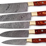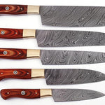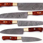 Damascus Chef Knife Set with Cleaver 5 pieces Exotic Wood Brass Bolsters Damascus Kitchen Knives Set Cowhide Leather Roll Kit
