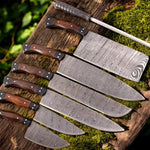 This exquisite set includes six custom handmade knives, each designed to meet the needs of both professional chefs and home cooks alike. With an overall length ranging from 13 inches to 8 inches and blade lengths of 8 inches, these knives are perfectly balanced for precision and control in the kitchen. The blades are crafted from high-quality Damascus steel, known for its exceptional sharpness and stunning patterns, making each knife not only a tool but a work of art.