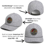 • COMFORT SNAP™ rear closure couples elastic stretch with the adjustability of a snapback