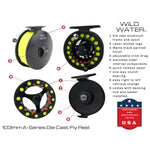 • Fly Reel: 103mm diameter spool, die cast aluminum, adjustable disc drag. Comes preinstalled with chartreuse, WF10-F, weight forward 10, floating fly line, 30# orange backing and 9’ 0X tapered monofilament leader. All Wild Water fly reels are easily changed from left to right hand retrieve. Reel will come in left hand retrieve unless right hand is requested.