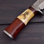 "Exquisite Custom Handmade Damascus Hunting Knife | Engraved Bone-Rose Wood Handle | 10 Inches | Leather Sheath | KBS Knives Store"