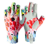 Our Fin-Flank Sun Gloves provide extreme sun protection as well as preventing blisters on long rows.  We use an exclusive rainbow trout skin print by Ryan Keene on these cooling wicking poly-Spandex Sun Gloves.  Extended finger reinforcements provide stripping protection.  The tough microfiber palms are perfect for fishermen, rowers, bikers, and anyone who wants to show off their general fishy-ness. Three sizes.