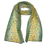 Our Fin-Flank Scarves let you show your fish-loving colors when out on the town.  We reproduce a brown trout skin print by A.D. Maddox using our proprietary printing process on this 100% silk scarf.