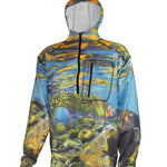 The heavyweight 1/4 Zip FlexShell is the top of the Fincognito fly fishing apparel and clothing line. Travis Sylvester's Freestone portrays a cutthroat trout immediately upon release.  The new 1/4-Zip FlexShell Graphic Fishing Hoodie features thumb-hole cuffs, a zippered chest pocket, an articulated hood, two side-seam pockets, and flexible-shell fabric for comfort and fit unmatched.  In a weather emergency, this wind-resistant hydro-phobic material will withstand a downpour for up to 30 minutes before wetting out.