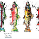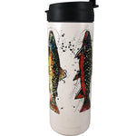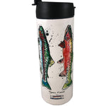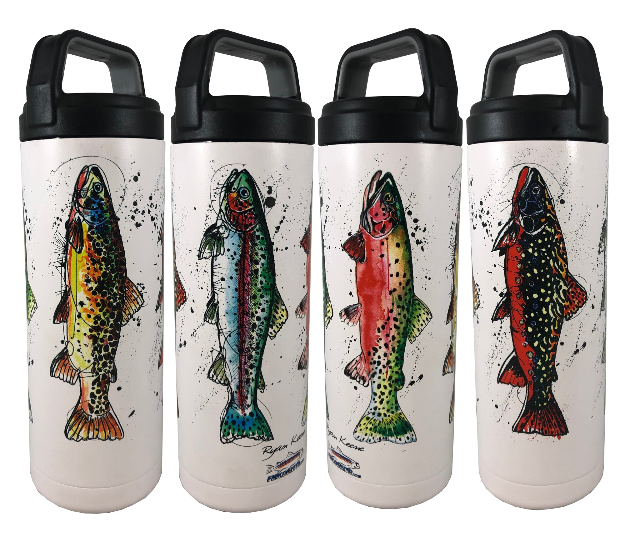Our 20 oz. double walled bottle will keep your cold beverages icy cold and your hot beverages steaming for hours. Shipped with a screw off water bottle top and a flip top coffee lid, you’re set for the drive to the put-in or all day in the boat. Featuring stunning artwork from Ryan Keene, we present the grand slam of trout fishing...rainbow trout, western cutthroat, brown trout and brook trout. White bottle.