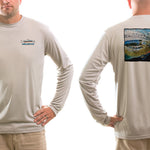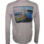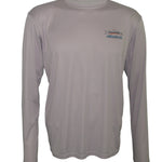 Lightweight sun protective SPF 50 fishing shirts.  We place Travis Sylvester's "Whiplash" on the back of this athletic grey-colored long sleeve T.  The Fincognito logo adorns the left chest.  100% polyester with PURE-Tech wicking technology. Our fly fishing apparel works well on the water or as hiking clothes on the trail. Great sun protection, moisture wicking apparel.