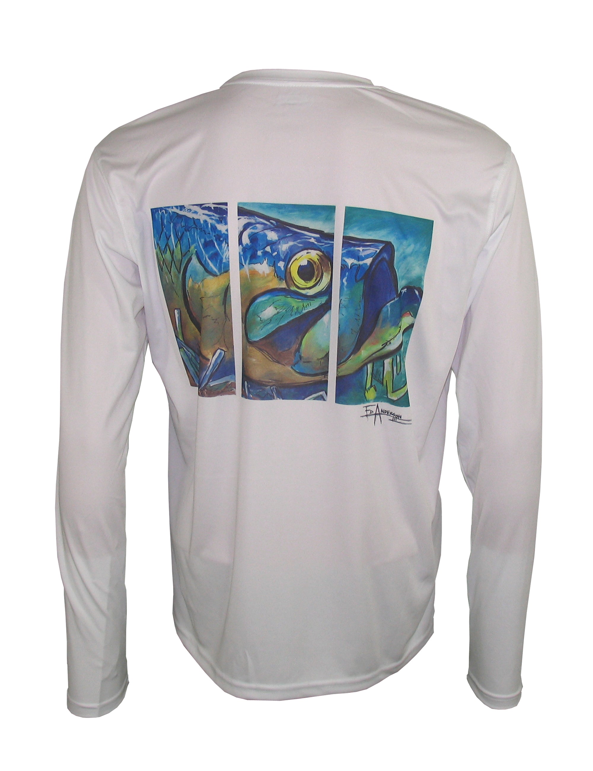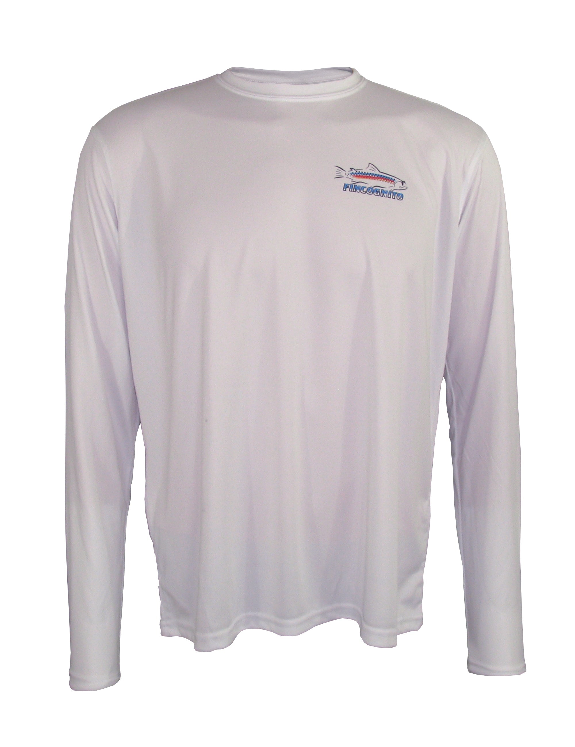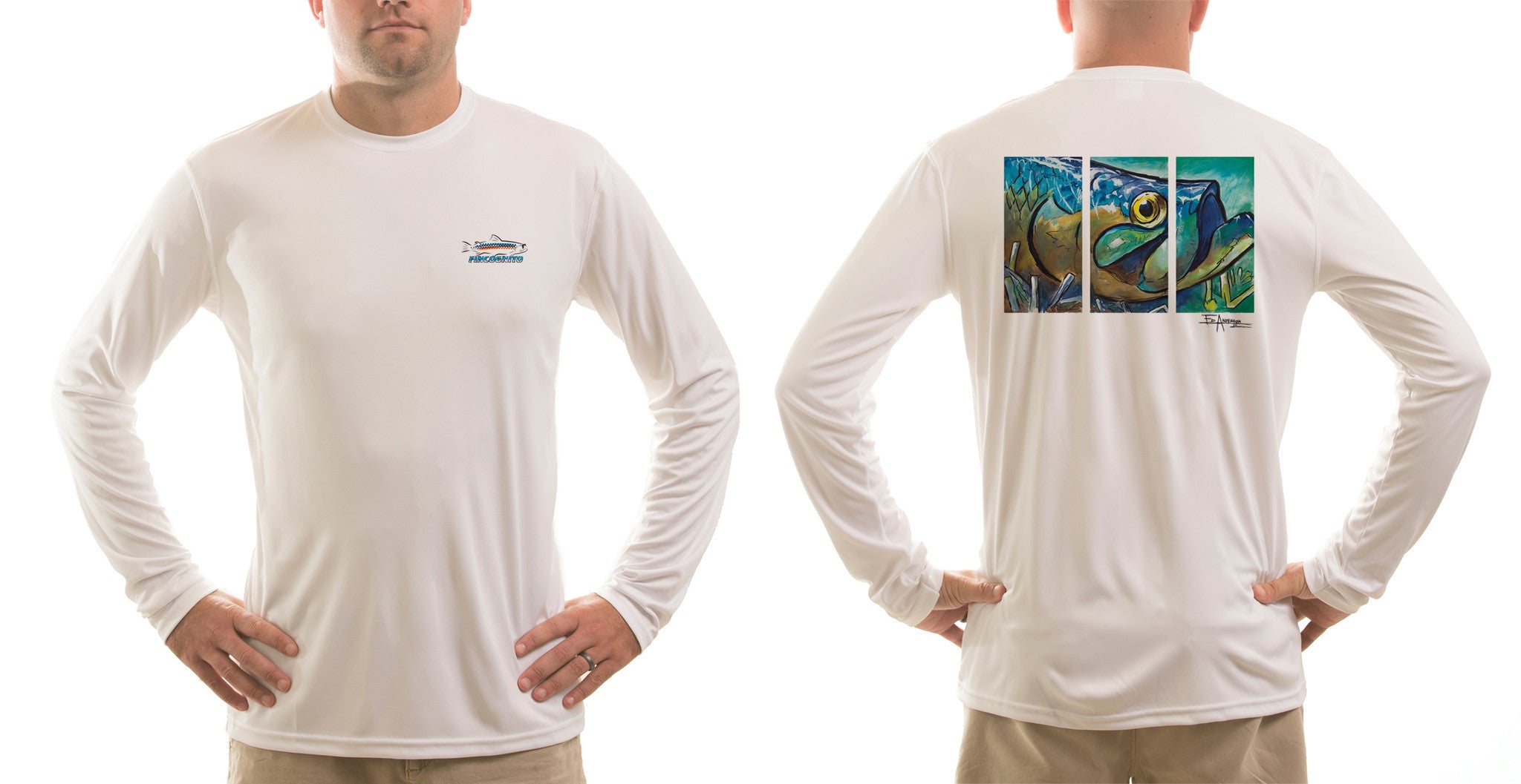 Lightweight sun protective SPF 50 fishing shirts.  We place Ed Anderson's "Tarpon Layup" on the back of this white-colored long sleeve T.  The Fincognito logo adorns the left chest.  100% polyester with PURE-Tech wicking technology. Our fly fishing apparel works well on the water or as hiking clothes on the trail. Great sun protection, moisture wicking apparel.