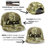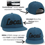The LOCAL cap is made on our new Mesa 6-panel baseball cap design. With our signature lightweight poly micro ripstop performance fabric. This local design features a structured front and with a detailed chainstitched puff embroidery. Our COMFORT SNAP™ closure couple the stretch of elastic with the adjustability of a snapback, and will change they way you look at snapbacks. Lastly, new Local baseball cap features American Fit™ sizing which fits men's head sizes MD - XX.