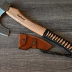 Embrace the power of ancient warriors with the Odin's Edge Norse Axe from KBS Knives Forged Factory. This exceptional axe features a custom handmade forged Damascus steel blade, renowned for its unparalleled sharpness and durability. The handle, crafted from ash wood and wrapped in leather, ensures a comfortable and secure grip, making it ideal for both combat and practical use. With a Rockwell Hardness of 55-60 HRC, the blade combines strength and resilience for consistent performance. Each axe is accompanied by a premium leather sheath for protection and convenience. Perfect for everyday tasks or as a collector's piece, "Odin's Edge" stands as a testament to craftsmanship and tradition.