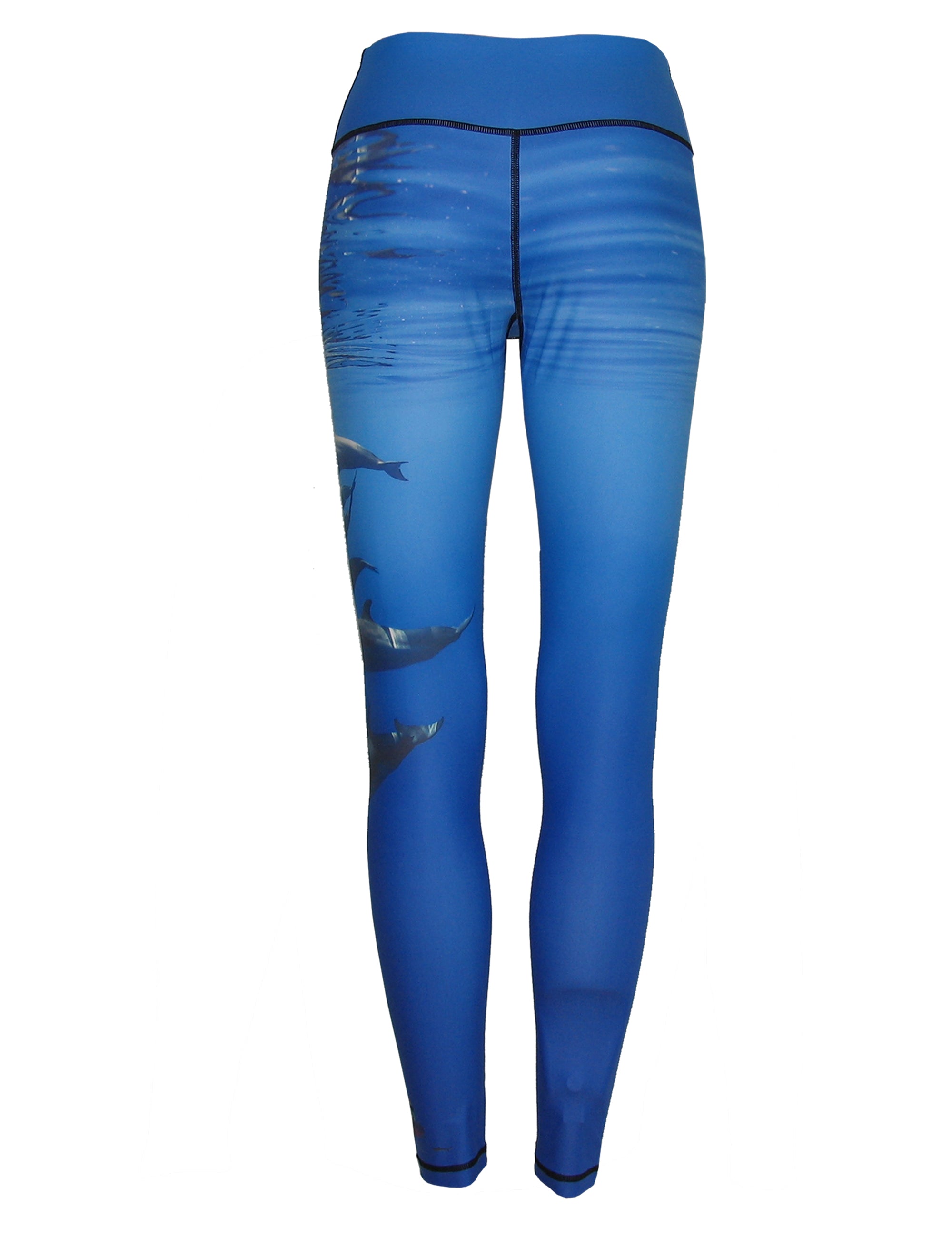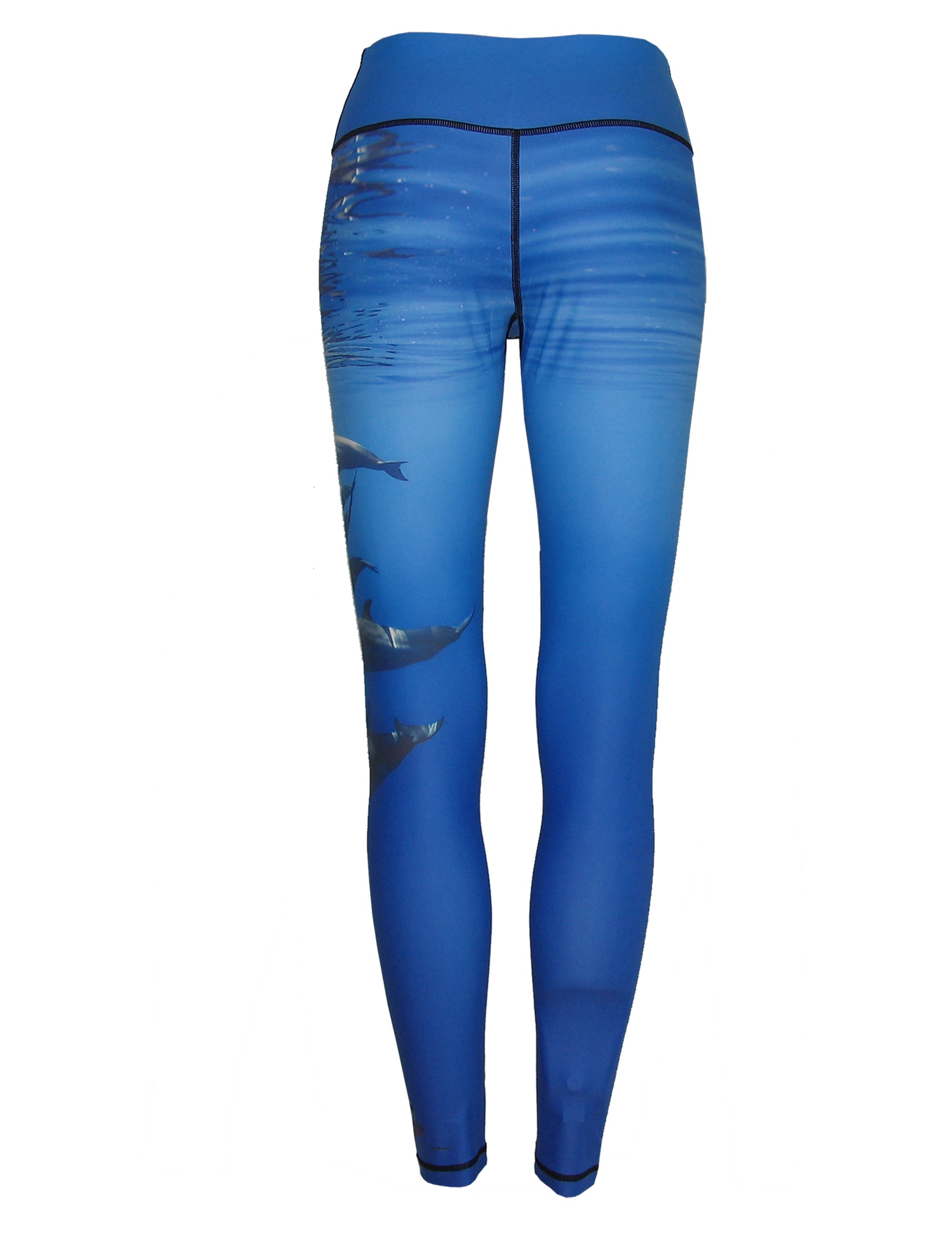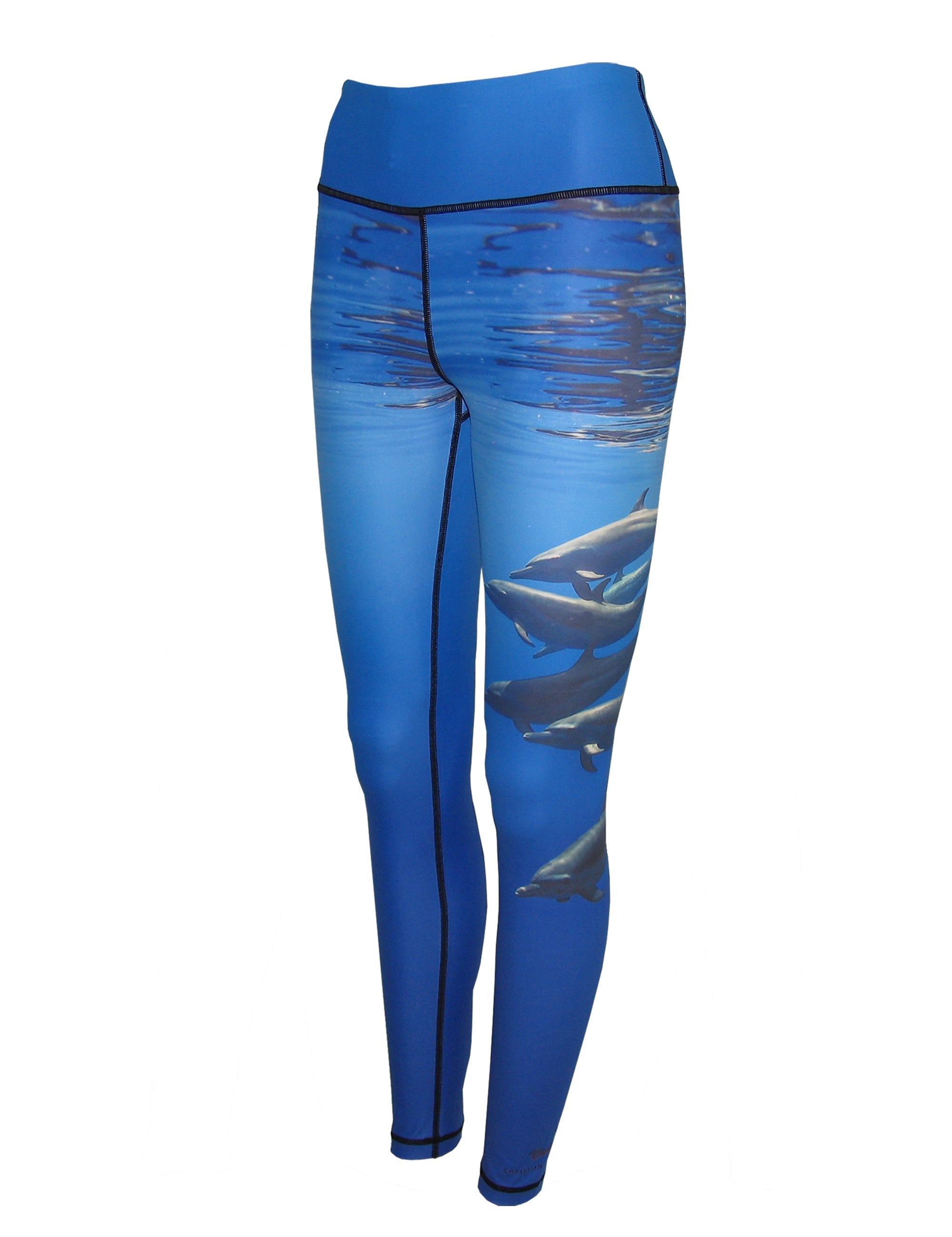 A pod of porpoises is shown in this Christian Vizl image placed on a performance yoga-style legging.  We make the best women's surf and dive clothing available.  Wear as beach wear, workout leggings, long underwear base layer, or for a night on the town.  Our surf and dive apparel works well as sun protective clothes on the beach or as a base layer for active sports.  Moisture wicking apparel with great sun protection.