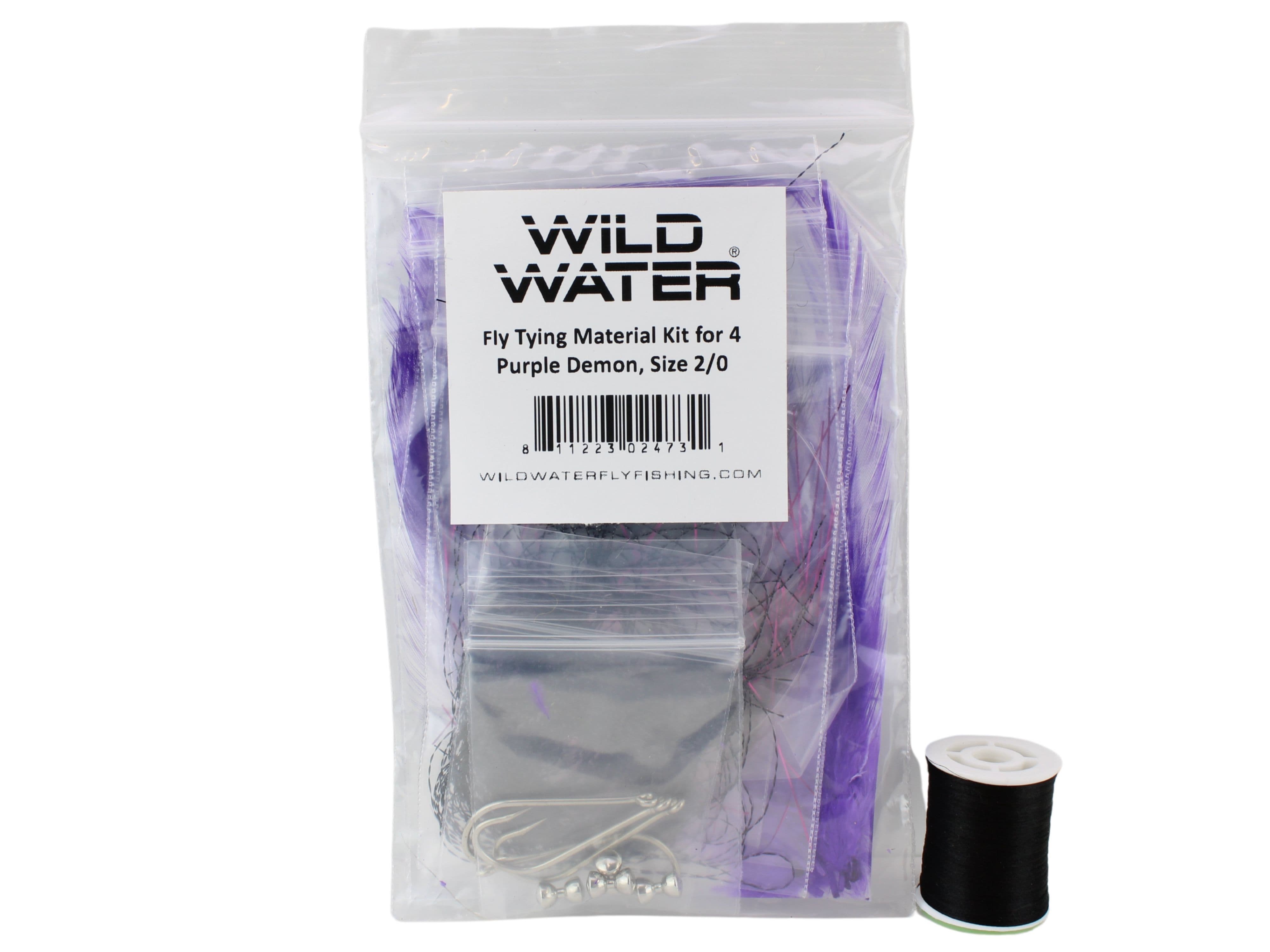 Wild Water's fly tying kits give you all the materials you need to tie a small batch of flies.  This kit gives you enough materials and hooks to tie 4 Purple Demon, hook size, 2/0.  You will also get a spool of thread and a sample tied fly with this kit.