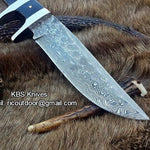 Introducing the Stealth Hunter Custom Handmade Damascus Fixed-Blade Hunting Knife, expertly designed for the serious hunter. This 10-inch knife features a full tang blade made from high-quality Damascus Steel, providing exceptional durability and a sharp edge for all your hunting needs. The handle is crafted from premium buffalo horn and equipped with a steel double finger guard, ensuring a secure and comfortable grip during use. With a Rockwell Hardness of 55-60 HRC, this knife is built to withstand rigorous field conditions. Each knife comes with a custom leather sheath for safe storage and easy transport, making it an essential tool for any outdoor enthusiast. Available for sale exclusively at KBS Knives Store.
