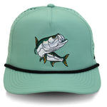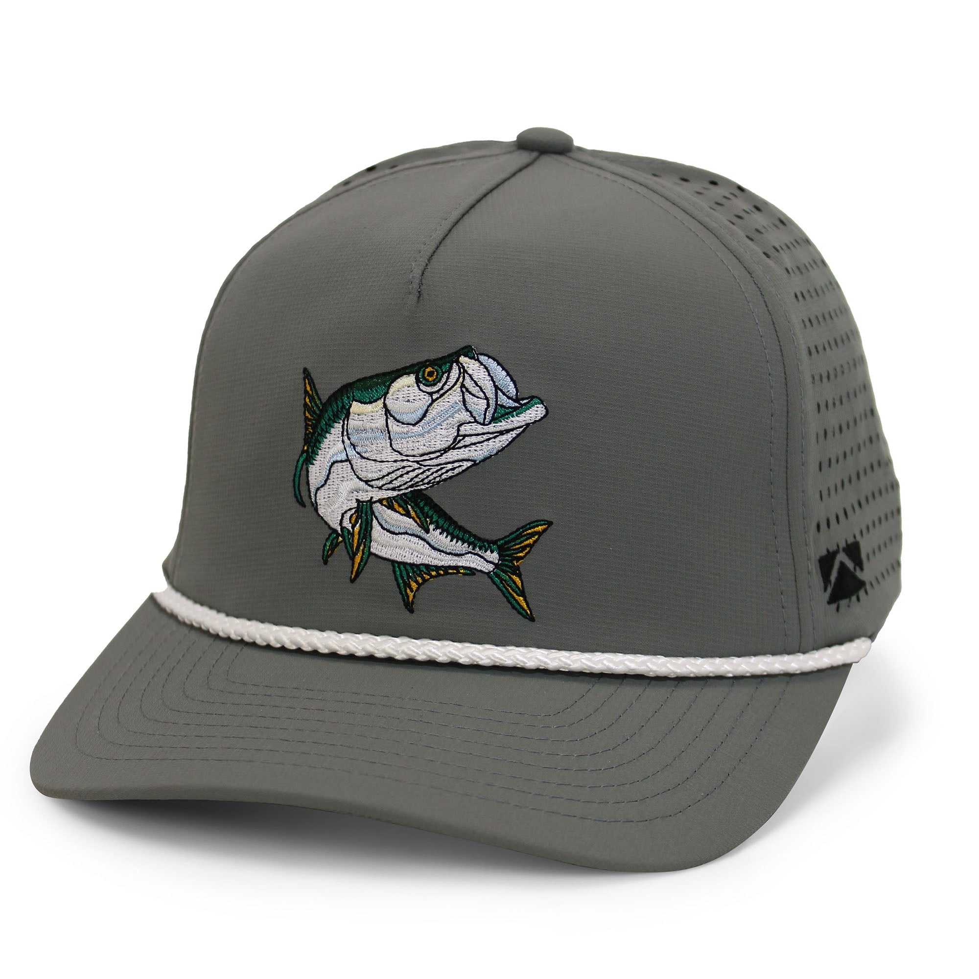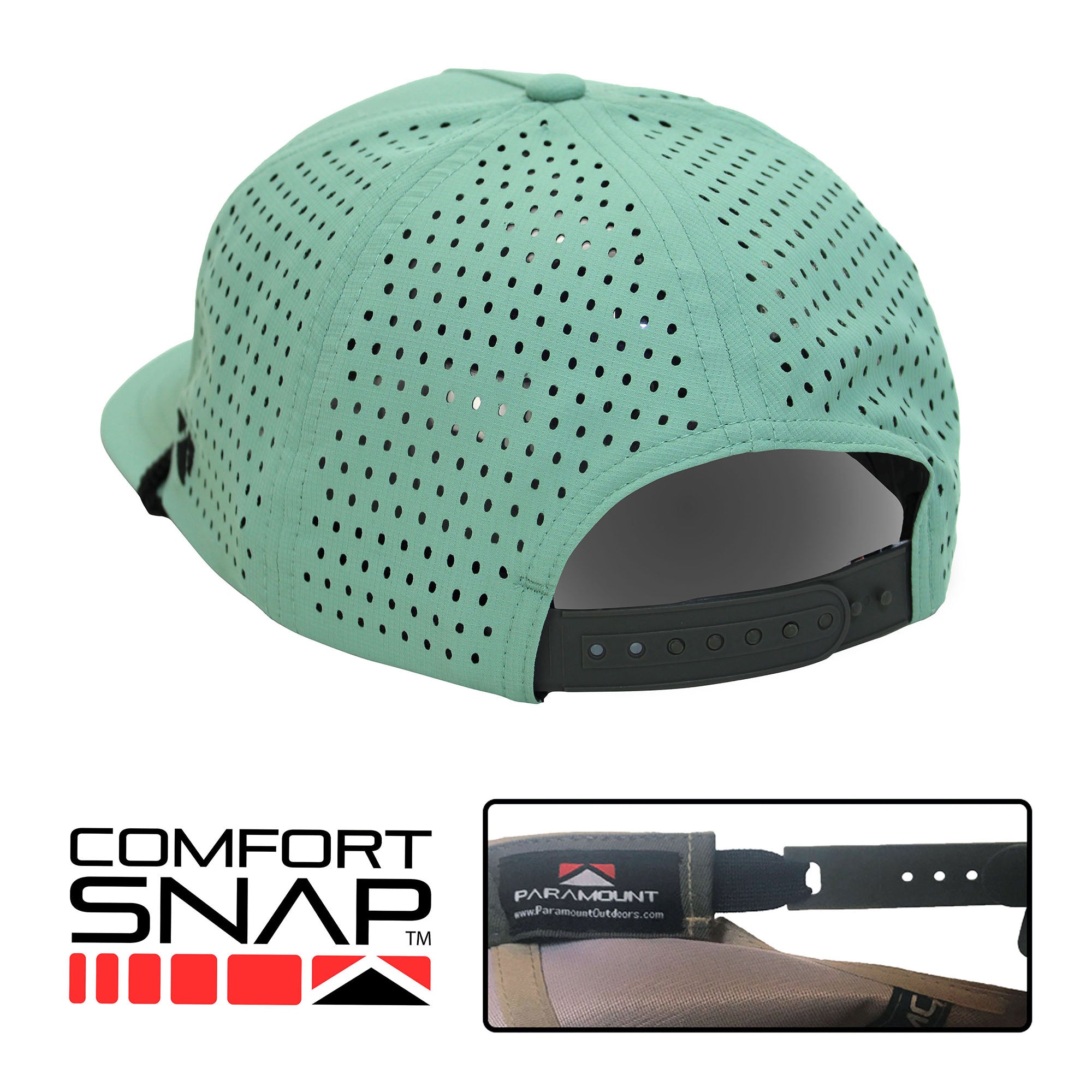 The Tarpon performance sport fishing hat is built on our Base Camp 5-Panel rope cap style. This saltwater fishing cap features laser perforated back panels with a structured front and a slightly curved visor. Constructed with lightweight micro ripstop quick dry performance fabric ideal for hot days on the casting deck. Our COMFORT SNAP™ snapback closure combines the stretch of elastic with the adjustability of a snapback, allowing for a custom stretch fit. Lastly, this tarpon hat features our American™ Fit sizing that fits men’s US head sizes MD – XX.