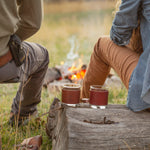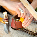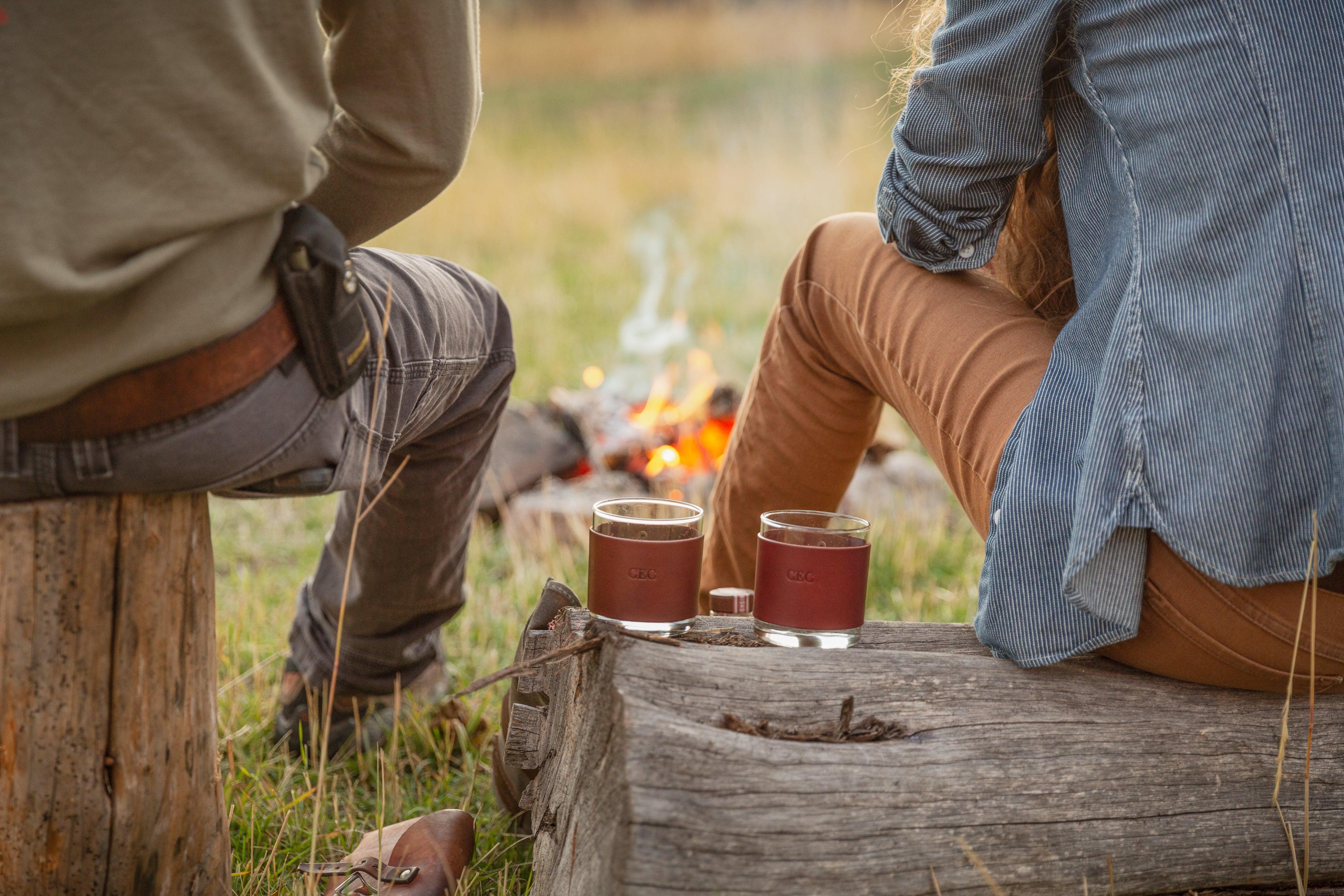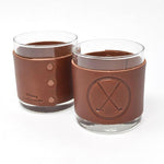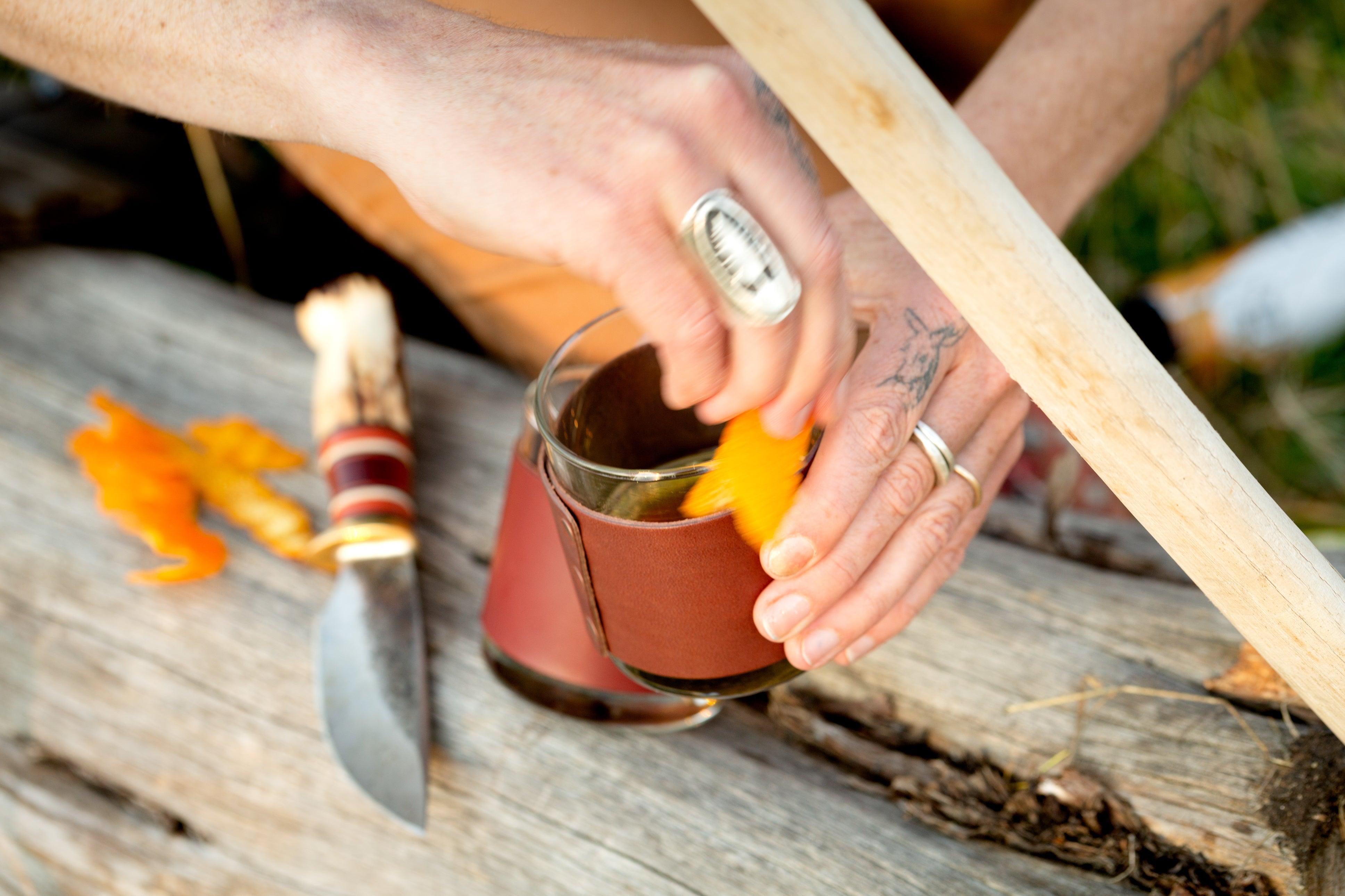 We’ve wrapped each glass in full-grain English Bridle leather from Wickett & Craig. The removable wrap is hand-cut, hand-stamped, and secured with antique copper rivets — made one at a time in our shop.