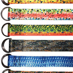 Fish print belts!  We transfer our exclusive fish prints to 48" tough webbing belts.  You can cut to size, melt the raw edge, and use the leftover piece as a bookmark.  Best of all, we use Josh Udesen's Trout Dreams print...sure to delight.