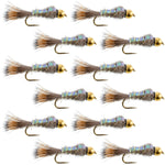 Pack of 12 Tungsten Gold Ribbed Hare's Ear Flash Back Fly Nymph Flies - Hook Size 12